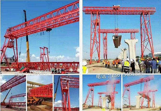 提梁机既可两台配合抬吊预制梁,也可以单台起重机配双吊具起吊预制梁,两台同时起重的提梁机各自的起重量一般为450吨,单台起重的提梁机起重量通常可达900吨。它配置支腿行走、天车行走及天车起吊设备,可以实现机械化动作。主要用于将预制梁从制梁台提吊至存梁台位,预制梁养护完成后将其从存梁台位吊运到运梁车上。作为起重设备完成架桥机的组装和拆卸。还用于架设墩身不高的旱桥。